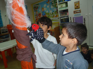 Hoje começámos o dia a brincar ao jogo dos 3 ratinhos, depois fizemos uma roda com a canção: